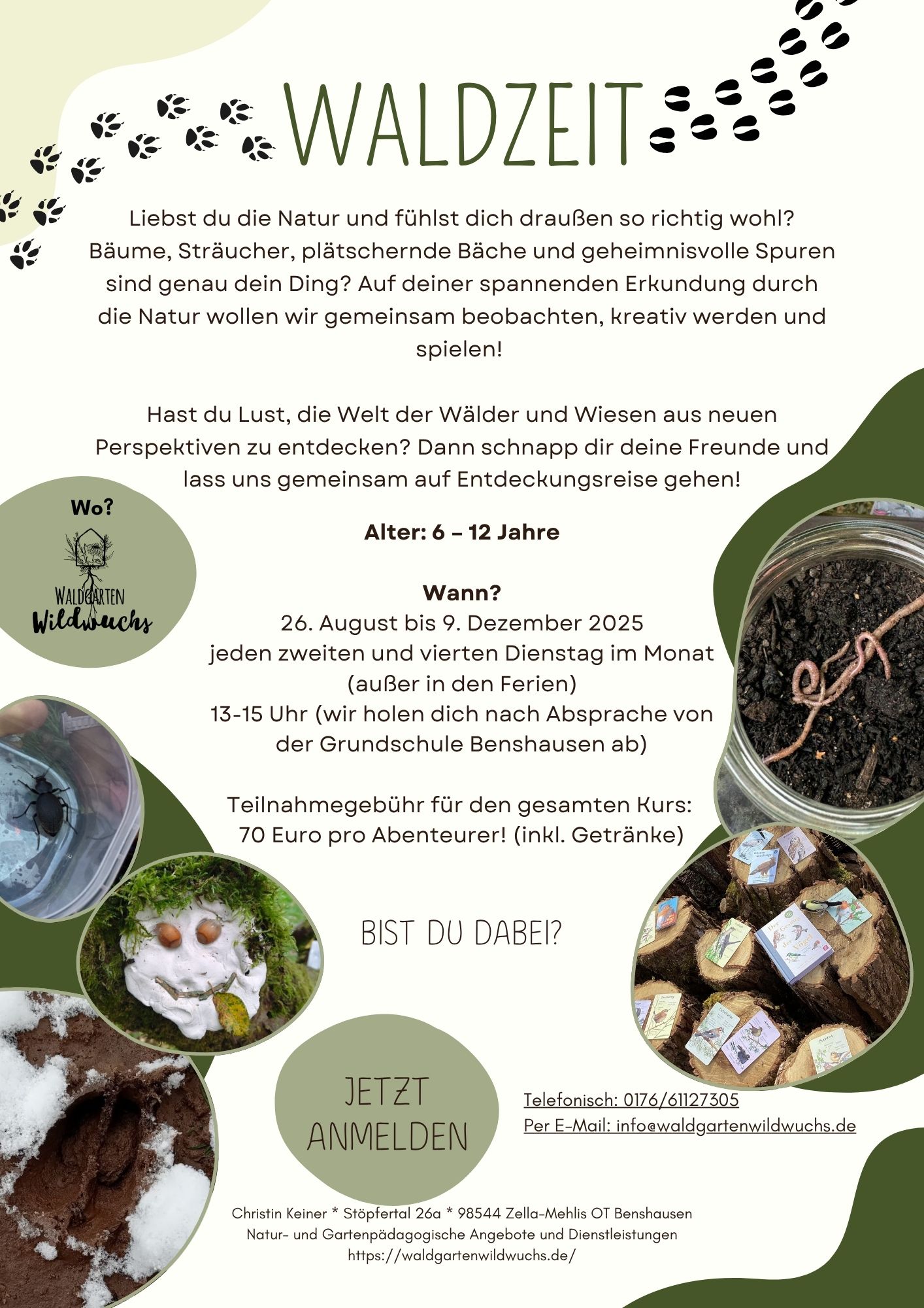 Du interessiert dich für die Natur und bist gerne draußen? Bäume, Sträucher, Flüsse, Fährten und Spuren sind dein Ding? Auf Spurensuche in der Natur ob beobachtend, kreativ oder im Spiel. Du willst lernen die Natur mit anderen Augen zu betrachten? Dann lass uns die Welt der Natur, des Waldes und des Gartens gemeinsam mit anderen Kids erkunden.
